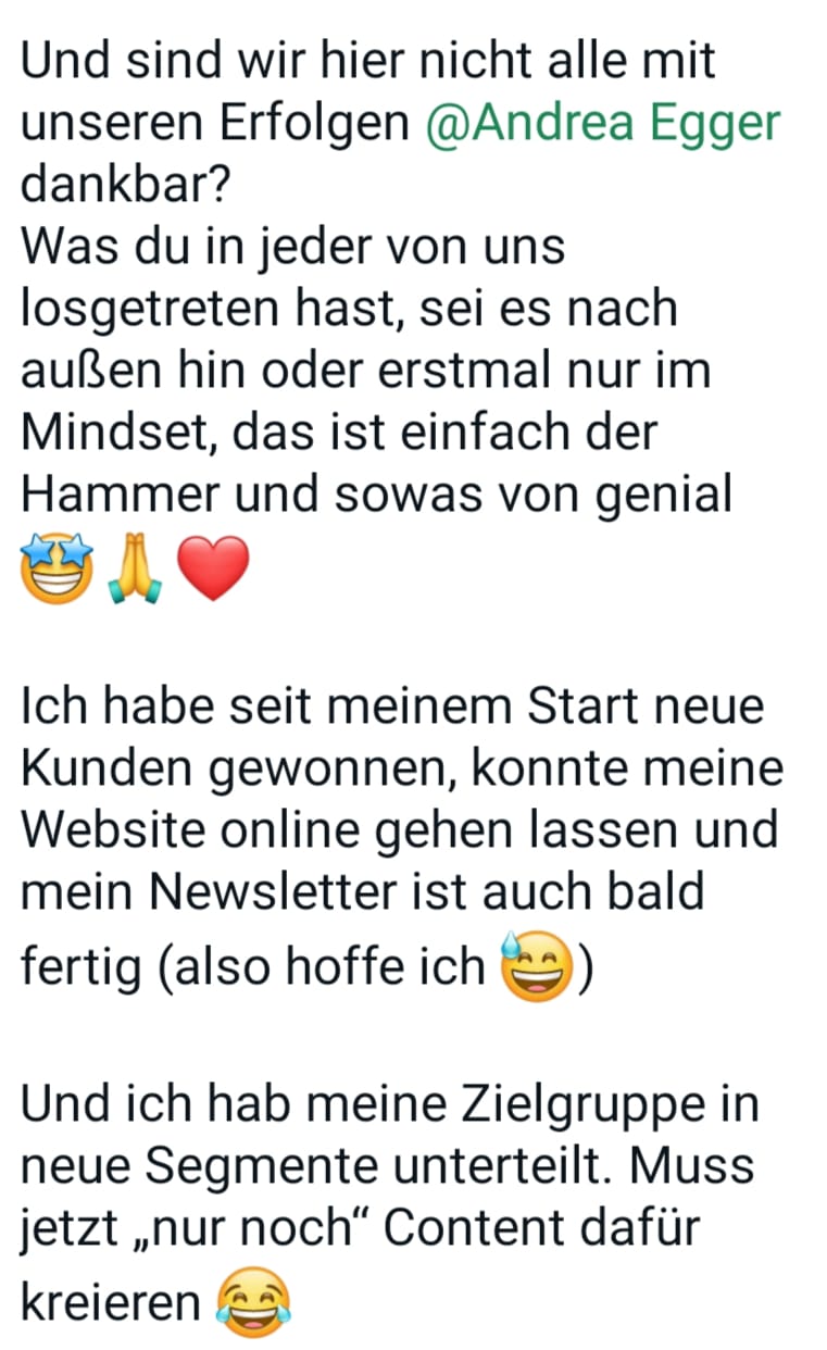 - WhatsApp-Support: ...und falls Du gerne Feedback hättest zu irgendetwas, oder eine kurze Frage hast, die nicht bis zur nächsten Q&A warten kann, steht Dir die WhatsApp-Gruppe quasi rund um die Uhr zur Verfügung