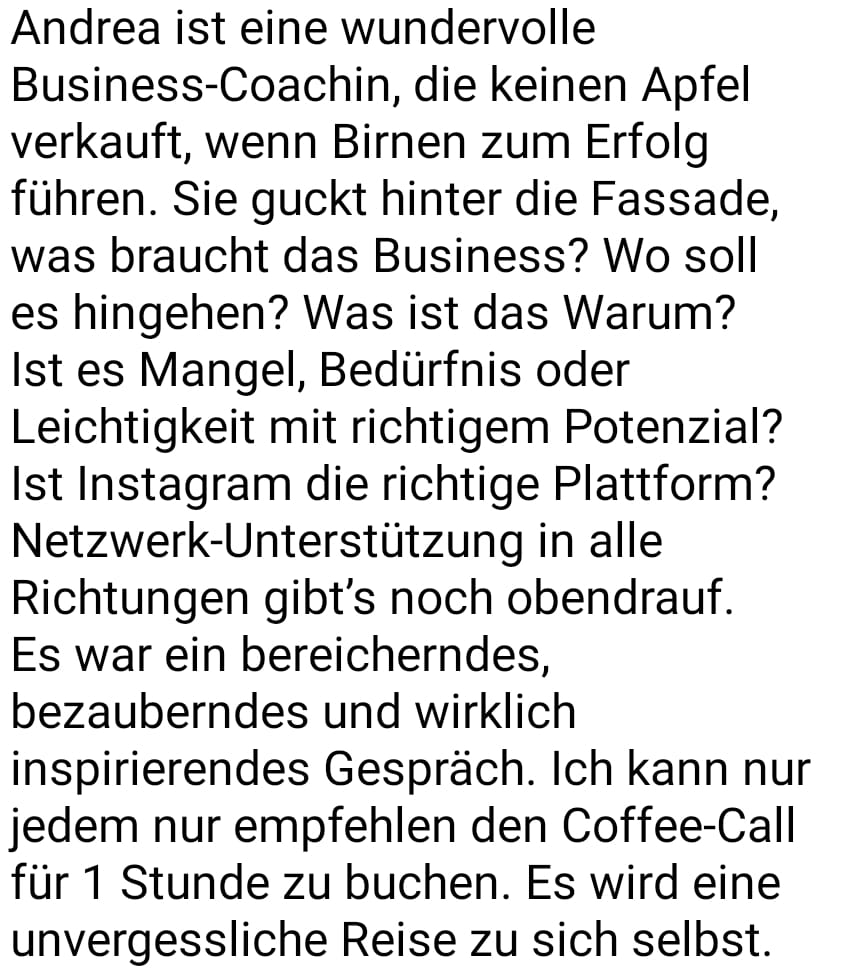 Hier wird Dir keine Strategie "übergestülpt", sondern wir finden einen Weg, der zu Dir, Deinem Business und Deiner Situation passt. Ein Weg, den Du langfristig aufrecht erhalten kannst. Hier gibt es keine Einheitslösungen, sondern individuelle Unterstützung, die wirklich funktioniert.