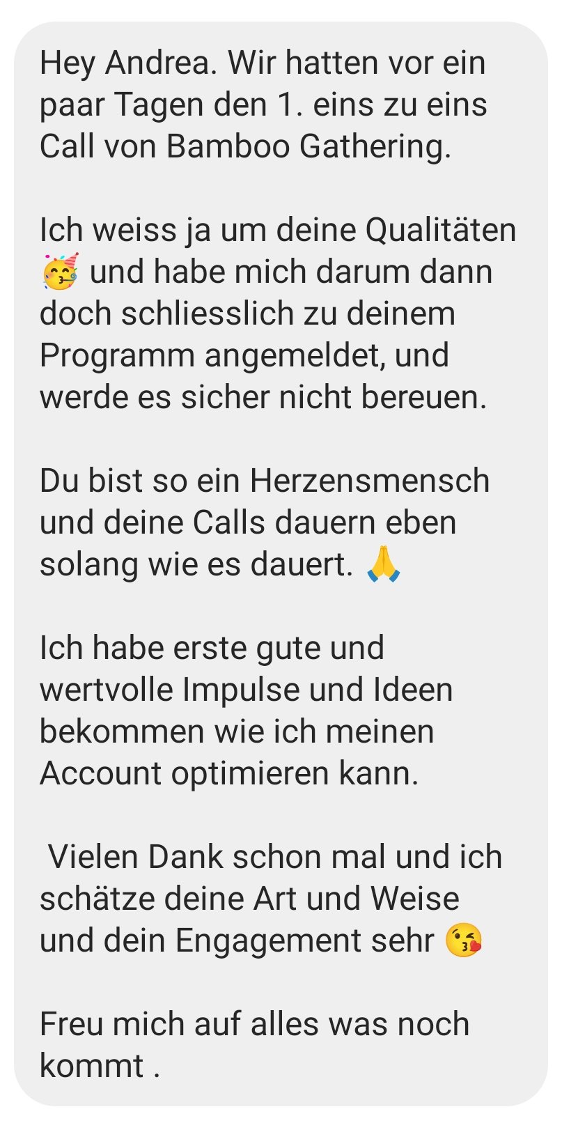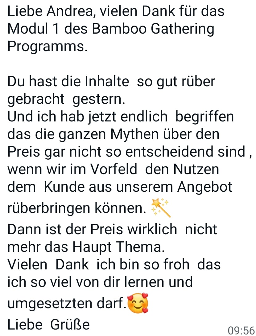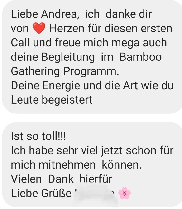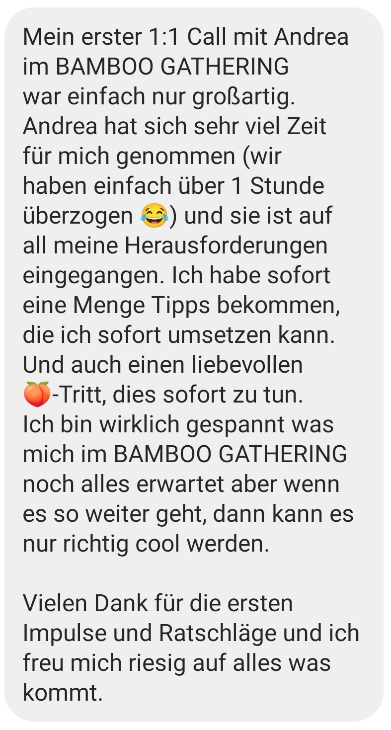 - 1. Einzelgespräch: 1:1 Call mit mir via Zoom zum Start (Wert: EUR 200) glaube mir, alleine DIESER CALL wird so viele AHA-Momente und neue Ideen für Dich bereit halten... Frag einfach mal ehemalige Teilnehmer von BAMBOO GATHERING :-)