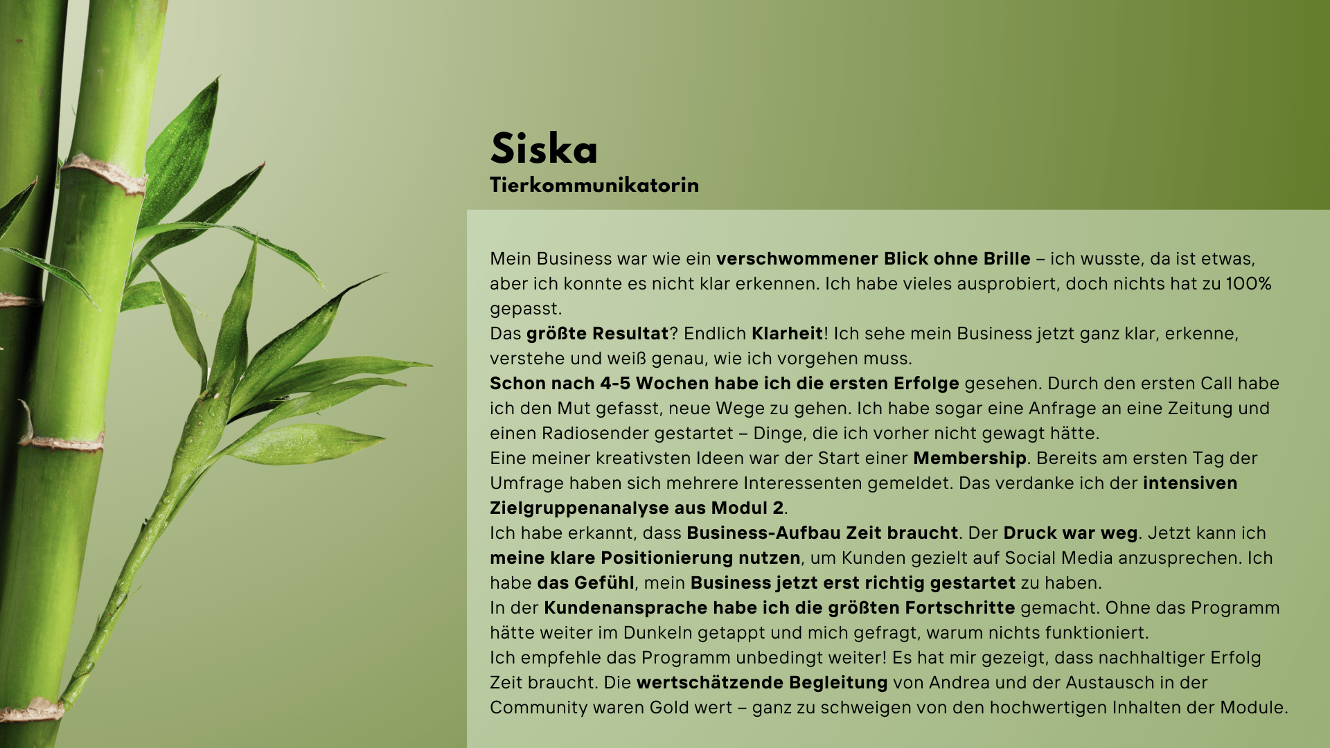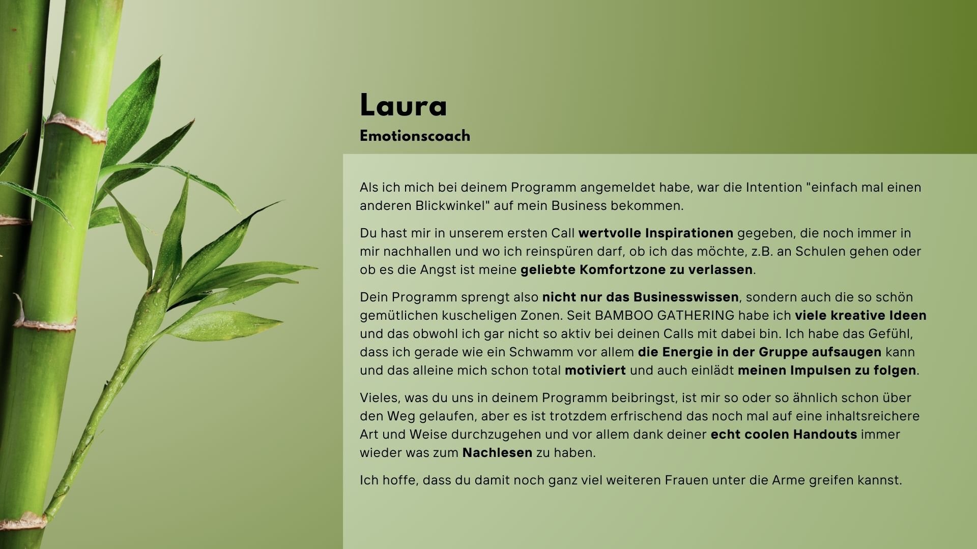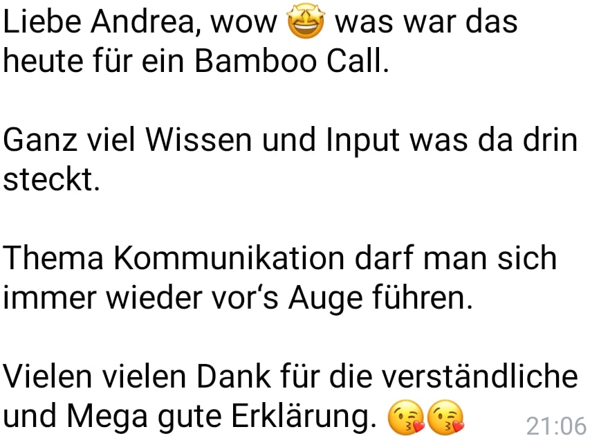 - 1. Einzelgespräch: 1:1 Call mit mir via Zoom zum Start (Wert: EUR 200) glaube mir, alleine DIESER CALL wird so viele AHA-Momente und neue Ideen für Dich bereit halten... Frag einfach mal ehemalige Teilnehmer von BAMBOO GATHERING :-)