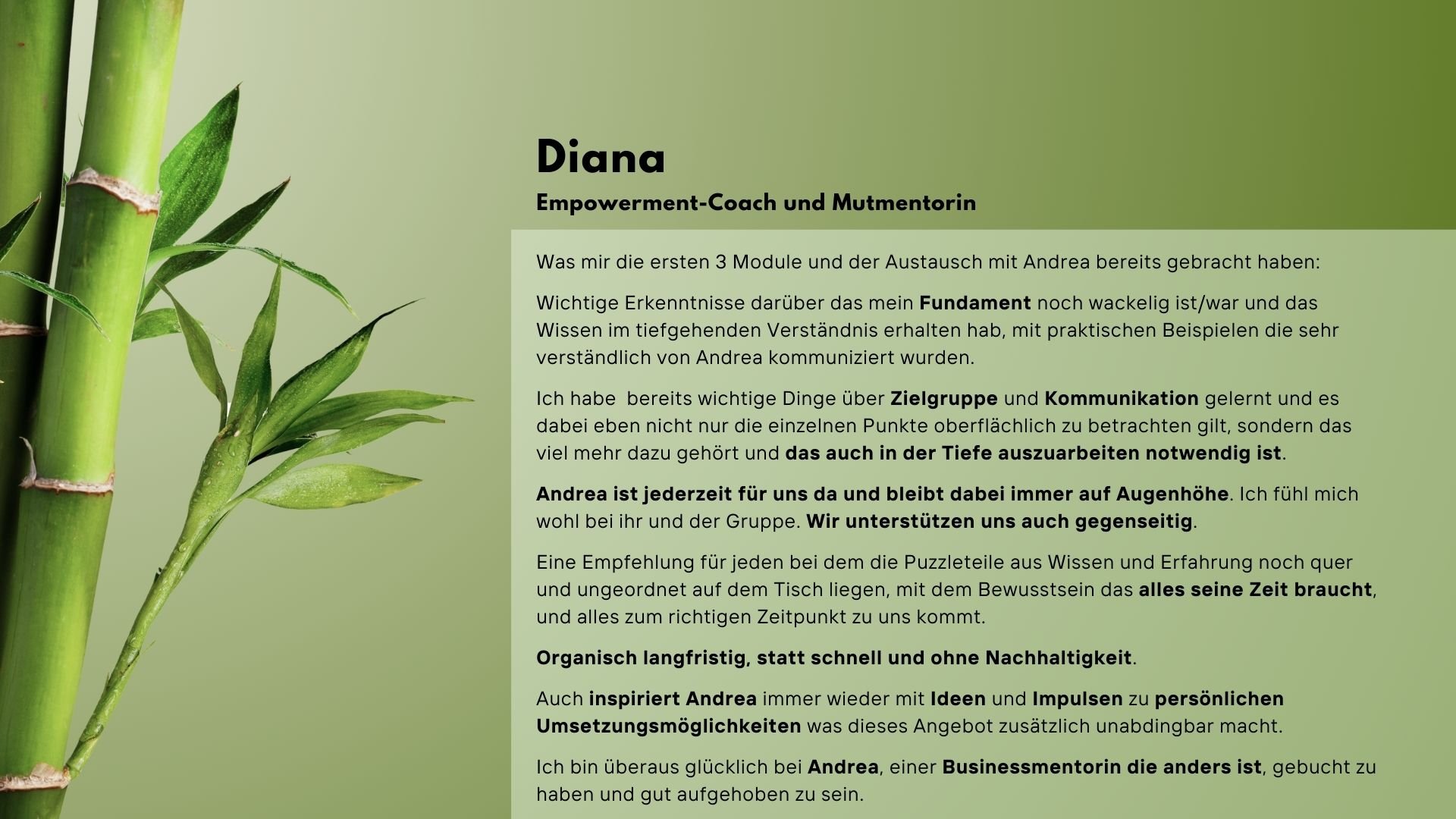 Willkommen beim BAMBOO GATHERING – dem exklusiven Raum für UnternehmerInnen, die mit Geduld ihre eigene Oase gestalten. Genauso wie ein Bambussamen Zeit braucht, um zu grünen Spitzen heranzuwachsen, benötigt auch dein Business Zeit und Pflege, um nachhaltig zu wachsen.